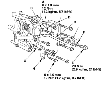 - Attach the torque converter to the drive plate with eight bolt (A). Rotate the crankshaft pulley as necessary to tighten the bolts to 1/2 of the specified torque, then to the final torque, in a crisscross pattern. After tightening the last bolt, check that the crankshaft rotates freely.