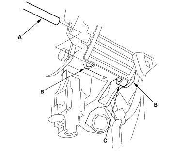 - Insert a 6.0 mm (0.24 in.) pin (A) into the positioning hole (B) on the shift lever bracket base through the positioning hole (C) on the shift lever. The shift lever is secured in [R] position.