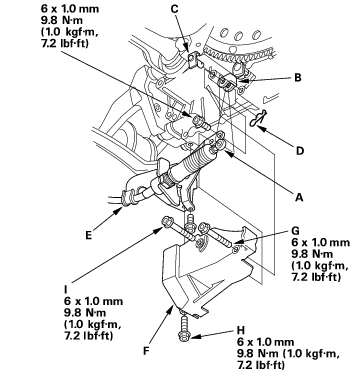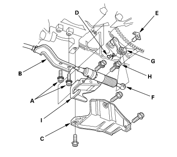 - Secure the shift cable bracket (H) with the bolts, and install the shift cable cover (I) with installing the mounting bolts loosely.