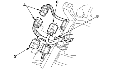 - Connect the A/T clutch pressure control solenoid valve A connector and 2nd clutch pressure switch connector (B), and install the harness clamps (C) on the clamp brackets (D).