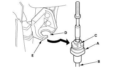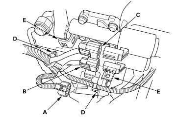 - Connect the shift solenoid harness connector (A), A/T clutch pressure control solenoid valve B connector, and solenoid valve C connector. Install the harness clamps (D) on the clamp brackets (E).