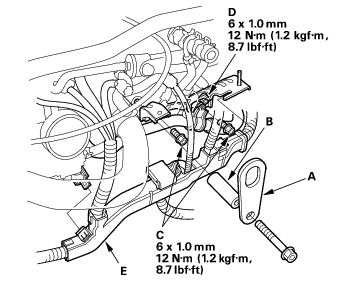 - Secure the shift cable bracket (E) with the bolt, and install the shift cable cover (F) with installing the mounting bolts loosely.