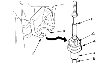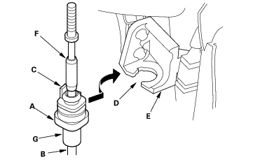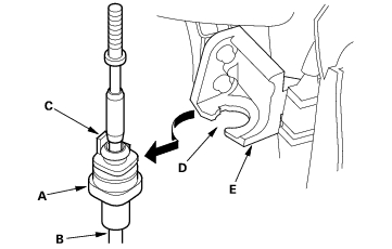 - Rotate the socket holder (A) on the shift cable (B) to face the tab (C) on the holder opposite to the opening (D) in the socket holder bracket (E). Align the holder with the opening the bracket, then slide the holder into the bracket. Rotate the holder a quarter turn to secure the shift cable. Do not install the shift cable by twisting the shift cable guide (F) and damper (G).
