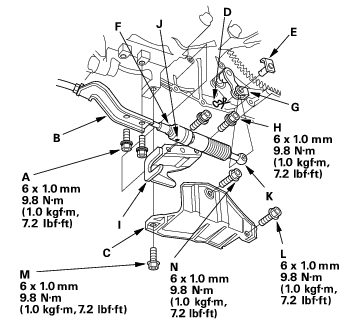 - Secure the shift cable bracket (F) with the bolt, and install the shift cable cover (A) with installing the mounting bolts loosey.