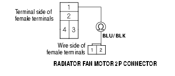- Check for continuity between the No. 1 terminal of the radiator fan relay 4P socket and the No. 2 terminal of the radiator fan motor 2P connector.