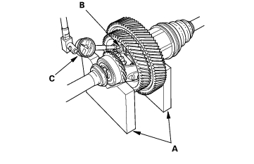 - Measure the backlash of both pinion gears (B) with a dial indicator (C). If the backlash is not within the standard, replace the differential carrier.
