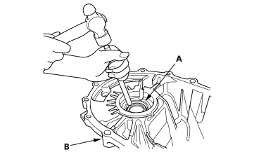 - Remove the oil seal (A) from the transmission housing (B).