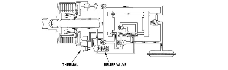 When the fluid pressure goes higher than the relief valve spring force, check valve R opens. Pressure applied at the clutch piston is held constant. This feature adds stability by preventing the rear wheel drive system from experiencing excessive torque.