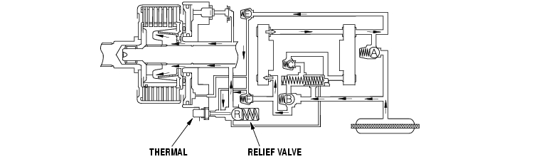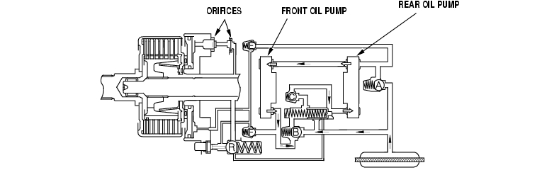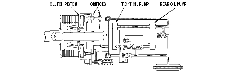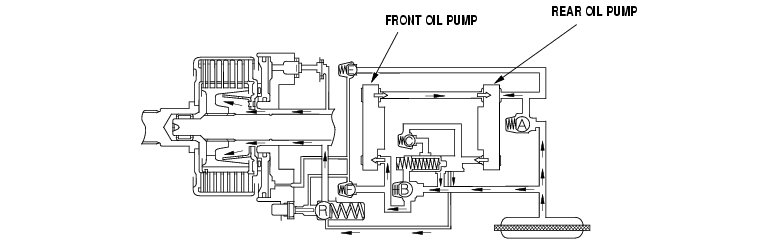 Fluid discharged by the front oil pump is drawn in by the rear oil pump and is circulated through the system. But, because the there is a difference in the capacity between the two pumps, fluid flows through check valve E, and then through orifices. This fluid lubricates and cools the clutch assembly and bearings.