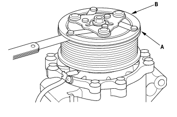 - Measure the clearance between the rotor pulley (A) and the armature plate (B) all the way around. If the clearance is not within specified limits, remove the armature plate (see page 21-48) and add or remove shims as needed to increase or decrease clearance.