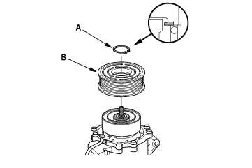 - If you are replacing the field coil, remove the snap ring (A) with snap ring pliers, then remove the rotor pulley (B). Be careful not to damage the rotor pulley and compressor.