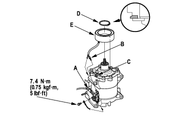 - Remove the bolt and holder (A), then disconnect the field coil connector (B). Loosen the clamp screw (C) to free the field coil wire. Remove the snap ring (D) with snap ring pliers, then remove the field coil (E). Be careful not to damage the field coil and compressor.