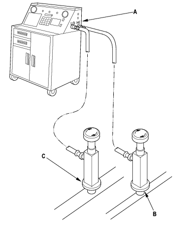 - Connect a R-134a refrigerant recovery/recycling/charging station (A) to the high-pressure service port (B) and the low-pressure service port (C), as shown, following the equipment manufacturer's instructions. Evacuate the system.