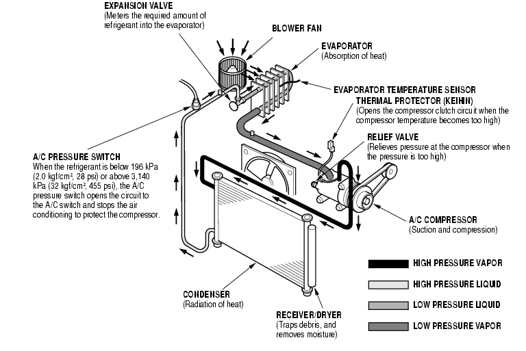The air conditioning system removes heat from the passenger compartment by circulating refrigerant through the system as shown below.