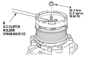 - Remove the center nut (A) while holding the armature plate with the special tool (B).