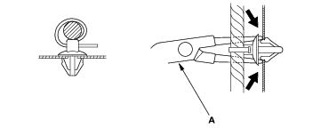 Slip pliers (A) under the clip base and through the hole at an angle, then squeeze the expansion tabs to release the clip.