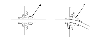 After installing harness clips, make sure the harness doesn't interfere with any moving parts. Keep wire harnesses away from exhaust pipes and other hot parts, from sharp edges of brackets and holes, and from exposed screws and bolts. Seat grommets in their grooves properly (A). Do not leave grommets distorted (B).