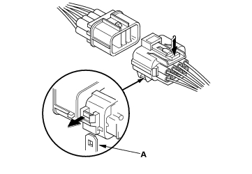 Some connectors have a clip on their side used to attach them to a mount bracket on the body or on another component. This clip has a pull type lock. Some mounted connectors cannot be disconnected unless you first release the lock and remove the connector from its mount bracket (A).