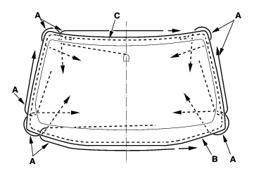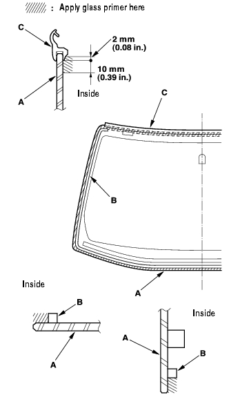 - With a sponge, apply a light coat of glass primer around the edge of the windshield (A) between the rubber dam (B) and molding (C) as shown, then lightly wipe it off with gauze or cheesecloth: