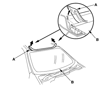- Remove the molding (A) from the upper edge of the windshield (B). If necessary, cut the molding with a utility knife.