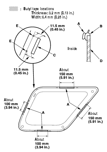 - If the old quarter glass is to be reinstalled (and either clip is broken off the molding), apply a light coat of primer (C-100, or equivalent), then apply butyl tape (A) to the molding (B) as shown. Glue the fastener (C) to the inside face of the quarter glass (D):