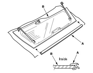 - Apply sealant (Cemedine P/N 08712-0004, or equivalent) (A) in the groove around the hatch glass weatherstrip (B).