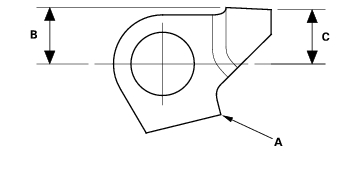 - Measure the distance (A) between the park pawl shaft (B) and the park lever roller pin (C).