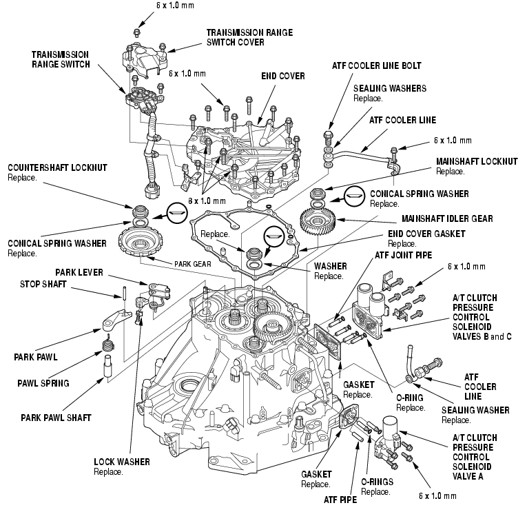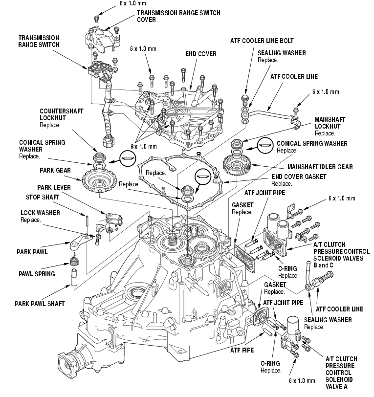 - Remove the A/T clutch pressure control solenoid valves B and C, then remove the ATF joint pipes and gasket.
