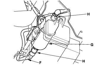 - Disconnect the fuel vapor hose (E) and hoses (F) and wire stay bolts (G). Slide back the clamps, then twist the hoses as you pull to avoid damaging them.