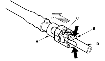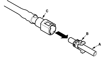 - Hold the connector (A) with one hand and squeeze the retainer tabs (B) with the other hand to release them from the locking pawls (C). Pull the connector off.
