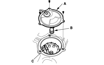- Remove the strainer case (A), the fuel gauge sending unit (B), the wire harness (C).
