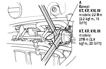 - Remove the pressure gauge, and reinstall the fuel pulsation damper with a new washer. Tighten the fuel pulsation damper to 22 N·m (2.2kgf·m, 16 lbf·ft) [KT, KP, KW, IN models: 27 N·m (2.8 kgf·m, 20 lbf·ft)].