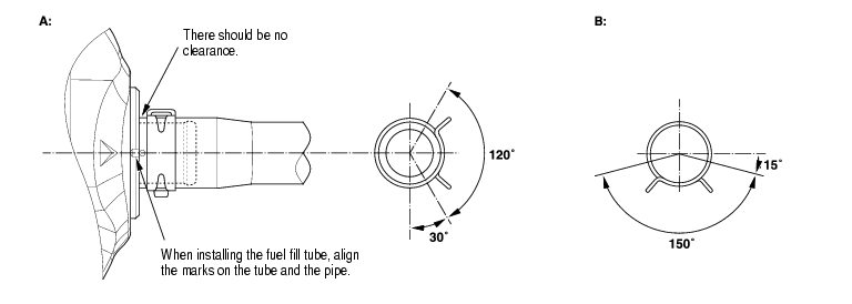 The fuel feed hose (B), fuel tube (D) and quick-connect fittings (H) are not heat-resistant; be careful not to damage them during welding or other heat-generating procedures. The fuel feed hose (B), fuel tube (D) and quick-connect fittings (H) are not acid-proof; do not touch them with a shop towel which was used for wiping battery electrolyte. Replace them if they came into contact with electrolyte or something similar. When connecting or disconnecting the fuel feed hose (B), fuel tube (D), and quick-connect fittings (H), be careful not to bend or twist them excessively. Replace them it damaged.