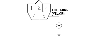 - Measure voltage between fuel pump 5P connector terminal No. 5 and body ground within the first 2 seconds after the ignition switch was turned ON (II).