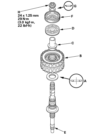 - Install the idler gear (F) on the mainshaft by a press, then install the conical spring washer (G) and locknut (H).