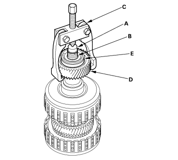 - Place a shaft protector (A) on the secondary shaft (B), and set the puller (C) to the idler gear (D), then remove the idler gear and ball bearing (E).