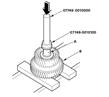 - Slide the reverse selector hub (A) over the countershaft (B), then press it in place with the special tool and a press.
