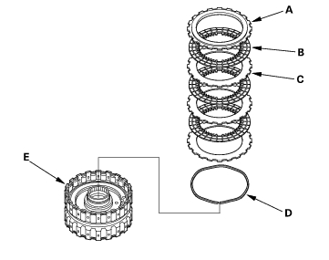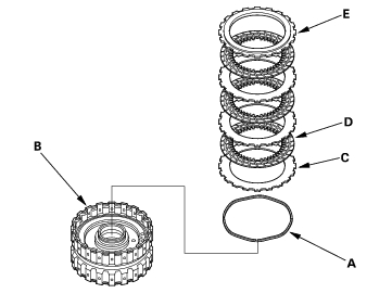 - Assemble the 4th clutch of K20A4 and K20A5 engine models: Install the waved spring (A) in the 4th clutch drum (B). Starting with the clutch waved-plate, alternately install the clutch plates (3) (C) and discs (3) (D), then install the clutch end plate (E) with the flat side toward the disc.