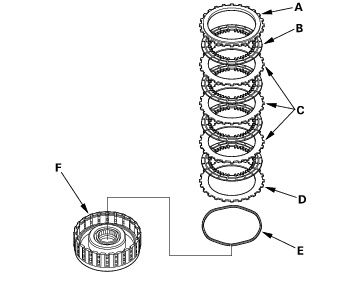 - Assemble the 2nd clutch of K20A4 and K20A5 engine models: Install the waved spring (A) in the 2nd clutch drum (B). Install the clutch flat-plate (C), then starting with the clutch disc, alternately install the clutch discs (4) (D) and waved-plates (3) (E), then install the clutch end plate (F) with the flat side toward the disc.