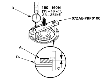 - Press the special tool down with 150 - 160 N (15 - 16 kgf, 33 - 35 lbf) using a force gauge, and read the dial indicator (B). The dial indicator reads the clearance (C) between the clutch end plate and top disc (D). Take measurements in at least three places, and use the average as the actual clearance.