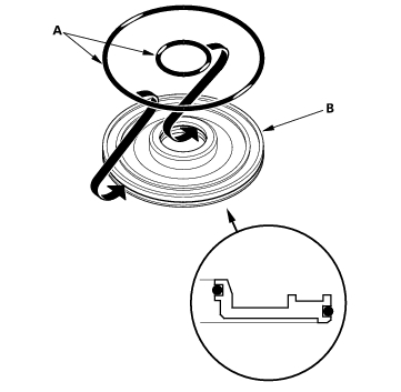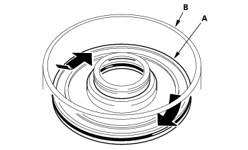 - Install the clutch piston (A) in the clutch drum (B). Apply pressure and rotate to ensure proper seating. Lubricate the piston O-ring with ATF before installing. Do not pinch the O-ring by installing the piston with to much force.