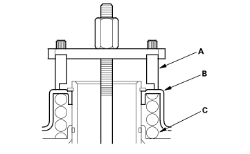 - Install the idler gear (A) on the secondary shaft (B), and install the ball bearing (C) over the idler gear with the special tool and a press.