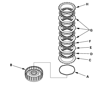 - Assemble the 2nd clutch of K24A1 engine model: Install the waved spring (A) in the 2nd clutch drum (B). Install the clutch flat-plate (C), clutch disc (D), and clutch flat-plate (E). Starting with the clutch disc, alternately install the clutch discs (4) (F) and clutch waved-pates (3) (G), then install the clutch end plate (H) with the flat side toward the disc.