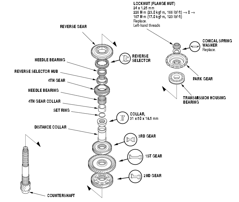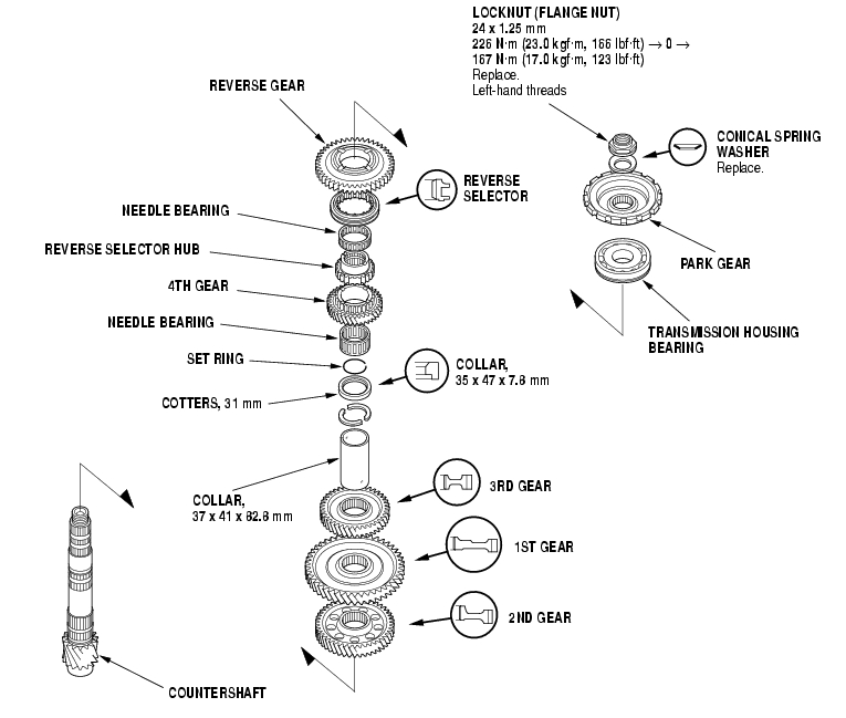 - Countershaft locknut has left-hand threads.