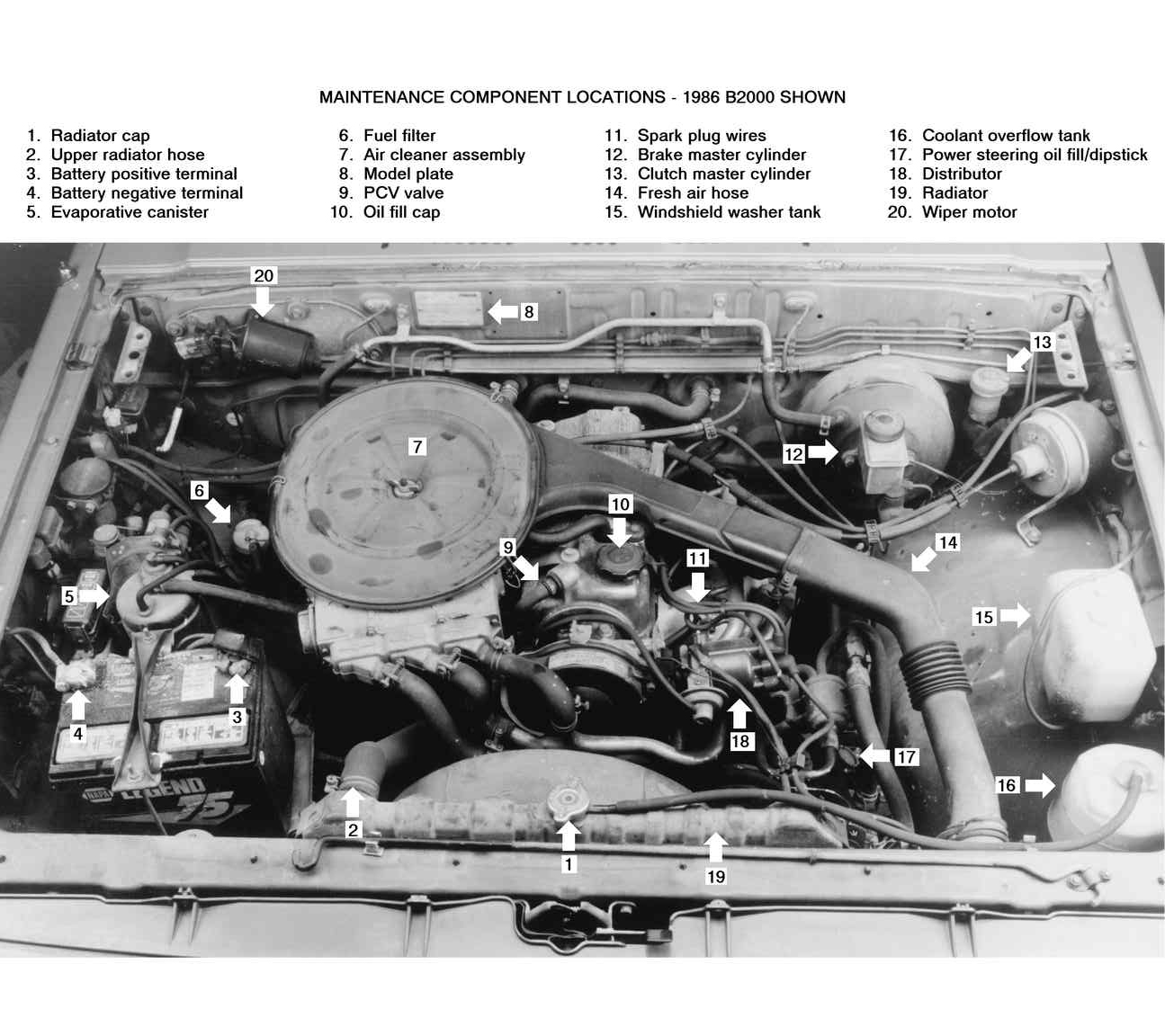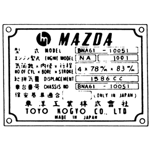 The engine number of the 1,586cc, 1,796cc and 1979–84 1,970cc is stamped on a machined pad on the right, front side of the engine block. On the diesel, it is stamped on a machined pad located on the front left side of the block, just above the injection pump. On the 1986 models, it is located on a machined pad on the left front of the block, just behind the distributor. On the Rotary Pick-up Truck, the engine number is located on a pad at the front of the engine housing, behind the distributor.