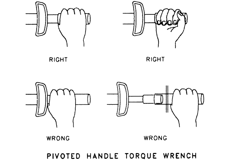 Some torque wrenches (usually of the click type) may be equipped with a pivot head which can allow it to be used in areas of limited access. BUT, it must be used properly. To hold a pivot head wrench, grasp the handle lightly, and as you pull on the handle, it should be floated on the pivot point. If the handle comes in contact with the yoke extension during the process of pulling, there is a very good chance the torque readings will be inaccurate because this could alter the wrench loading point. The design of the handle is usually such as to make it inconvenient to deliberately misuse the wrench.