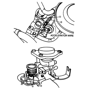 Fig. 1: View of the idle adjustment points on the diesel engine: accelerator cable locknut (1), accelerator cable adjusting nut (2), idle adjusting bolt locknut (3), idle adjusting bolt (4)