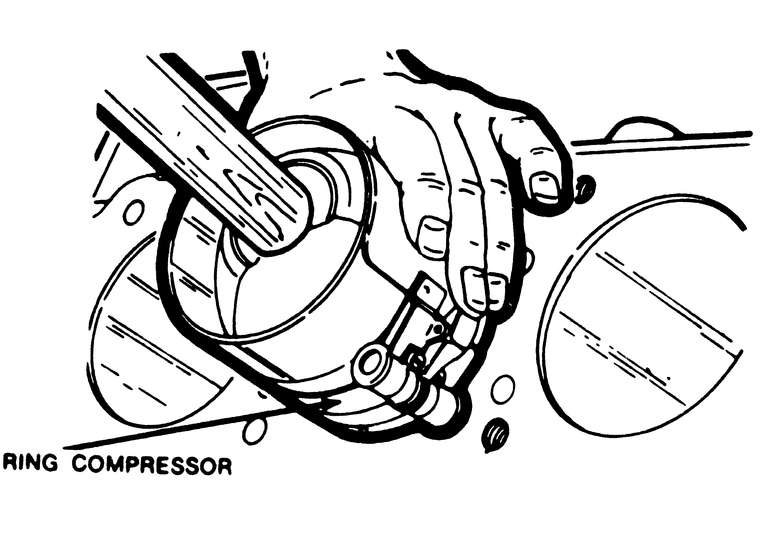 | Fig. 2: Using a wooden hammer handle, tap the piston down through the ring compressor and into the cylinder bore |