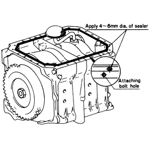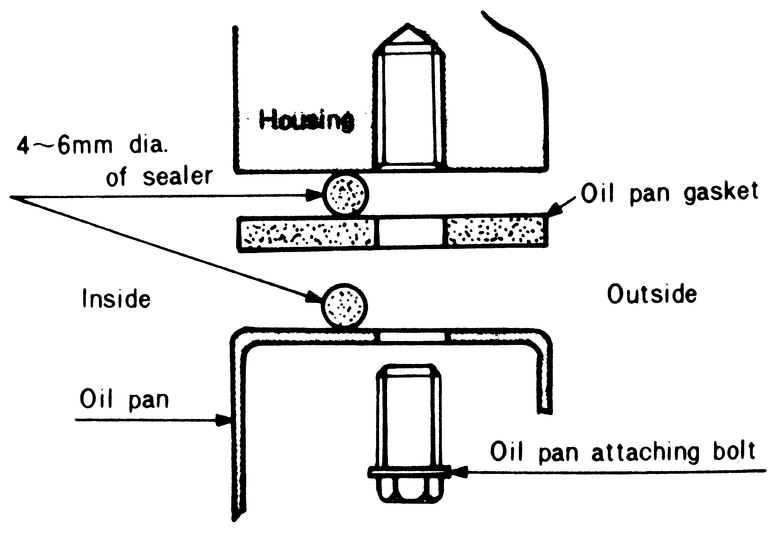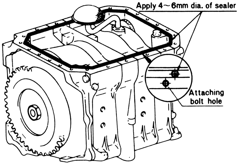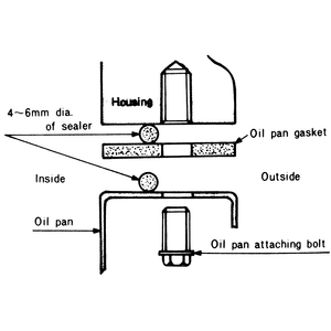 | Fig. 2: Apply a continous bead of RTV sealant to the inside of the bolt holes on the oil pan mounting flange before installing the gasket |