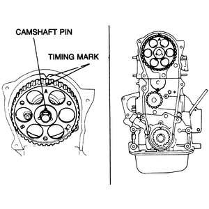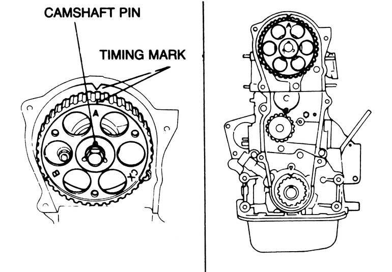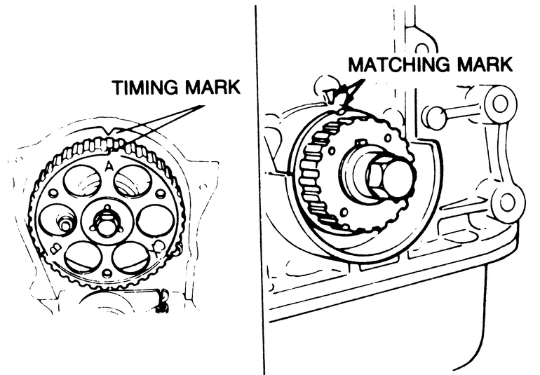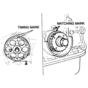 | Fig. 10: Camshaft (left) and crankshaft (right) timing marks on the 1,998cc engine |